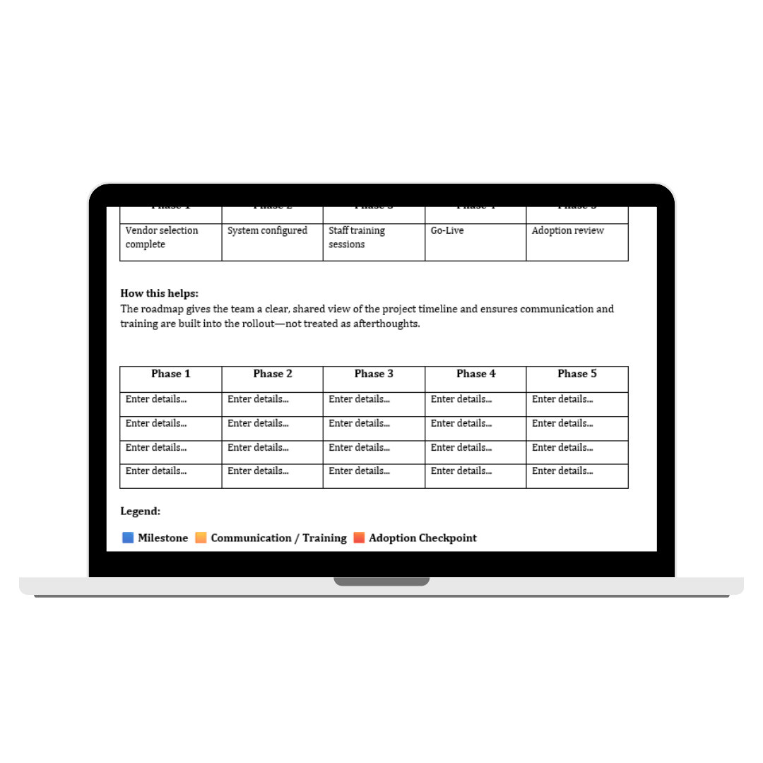 A high‑level visual timeline that helps you communicate phases, milestones, and priorities at a glance.